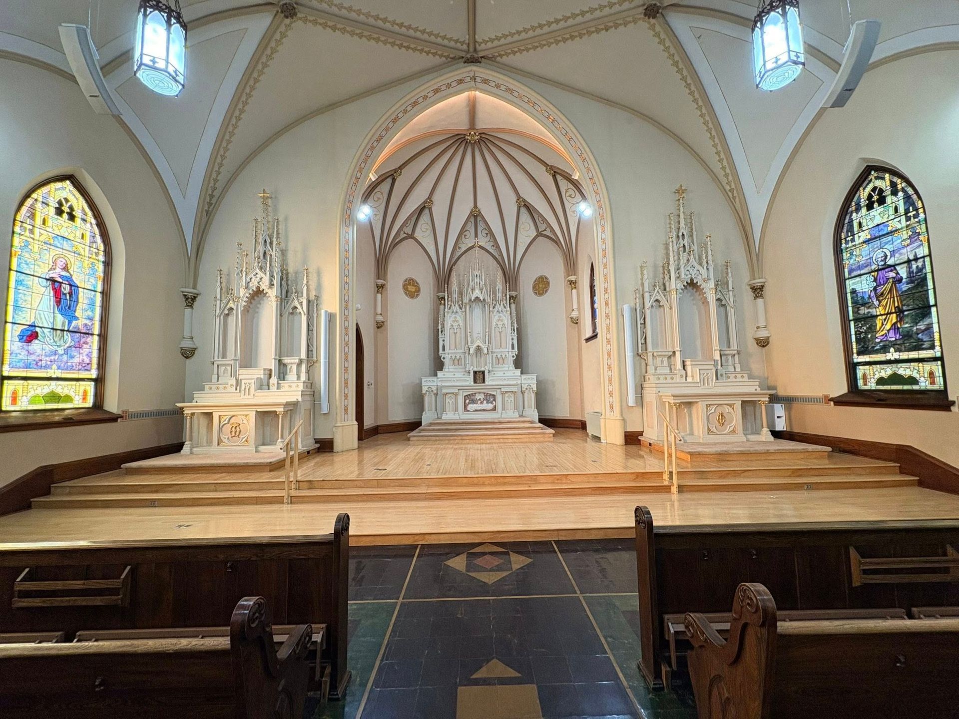 Construction of the third and present church building was begun in 1913 during Fr. Valentine Schiffrer's pastorate. During the construction the owner of the movie theater in Madison offered the facilities to the parish for Sunday services and Masses and other services were held there for many months. There was even a marriage held in the movie theater. The building was blessed by Bishop John Ireland on September 29, 1915.